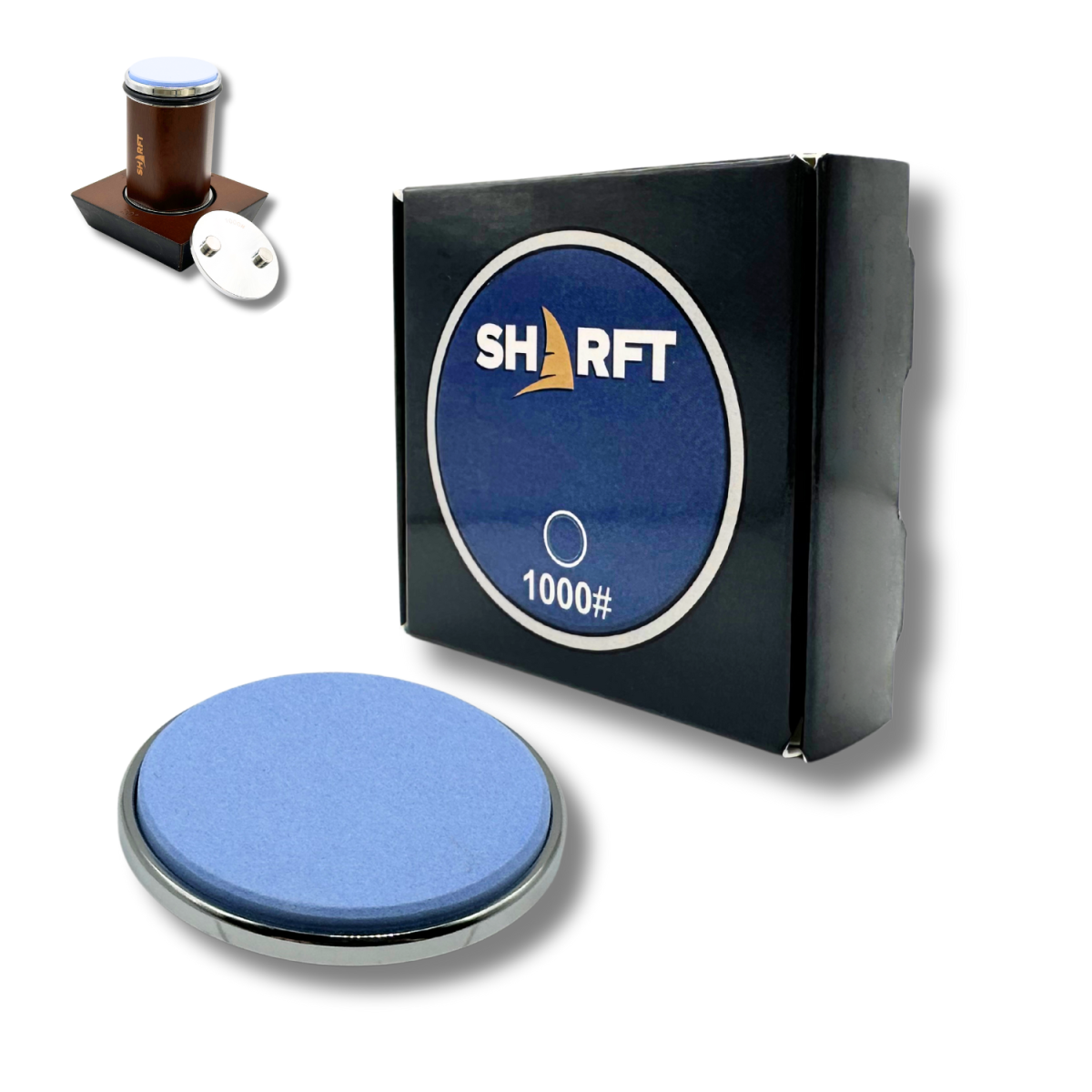 Le kit d'aiguisage SHARFT comprend cinq disques aimantés, amovibles et interchangeables de chaque côté de l'aiguiseur.